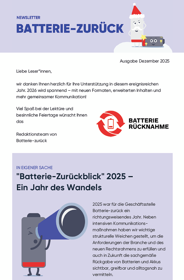 Wir freuen uns, den neuen Geschäftsführer der Geschäftsstelle zur Erfüllung der Hinweis- und Informationspflichten nach § 18 Abs. 3 und 4 BattG (Batterie-zurück) begrüßen zu dürfen: Andreas Kröniger übernimmt diese Position für das Geschäftsjahr 2025. Gleichzeitig verabschieden wir Michael Gormann (Landbell) und bedanken uns für sein Engagement als Geschäftsführer in 2024.