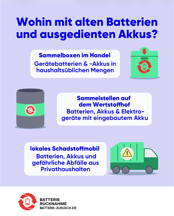 Gerätealtbatterien können überall im Handel, wo neue Batterien verkauft werden, unkompliziert und kostenlos in dafür vorgesehene Sammelbehälter abgegeben werden, z. B. in Supermärkten, in der Drogerie oder in Baumärkten. Auch an Wertstoffhöfen der Kommunen können leere Batterien und Akkus kostenlos abgegeben werden. Das betrifft übrigens auch größere Akkus aus dem Haushalt, wie beispielsweise aus Bohrmaschinen, Rasenmähern oder Staubsaugrobotern.